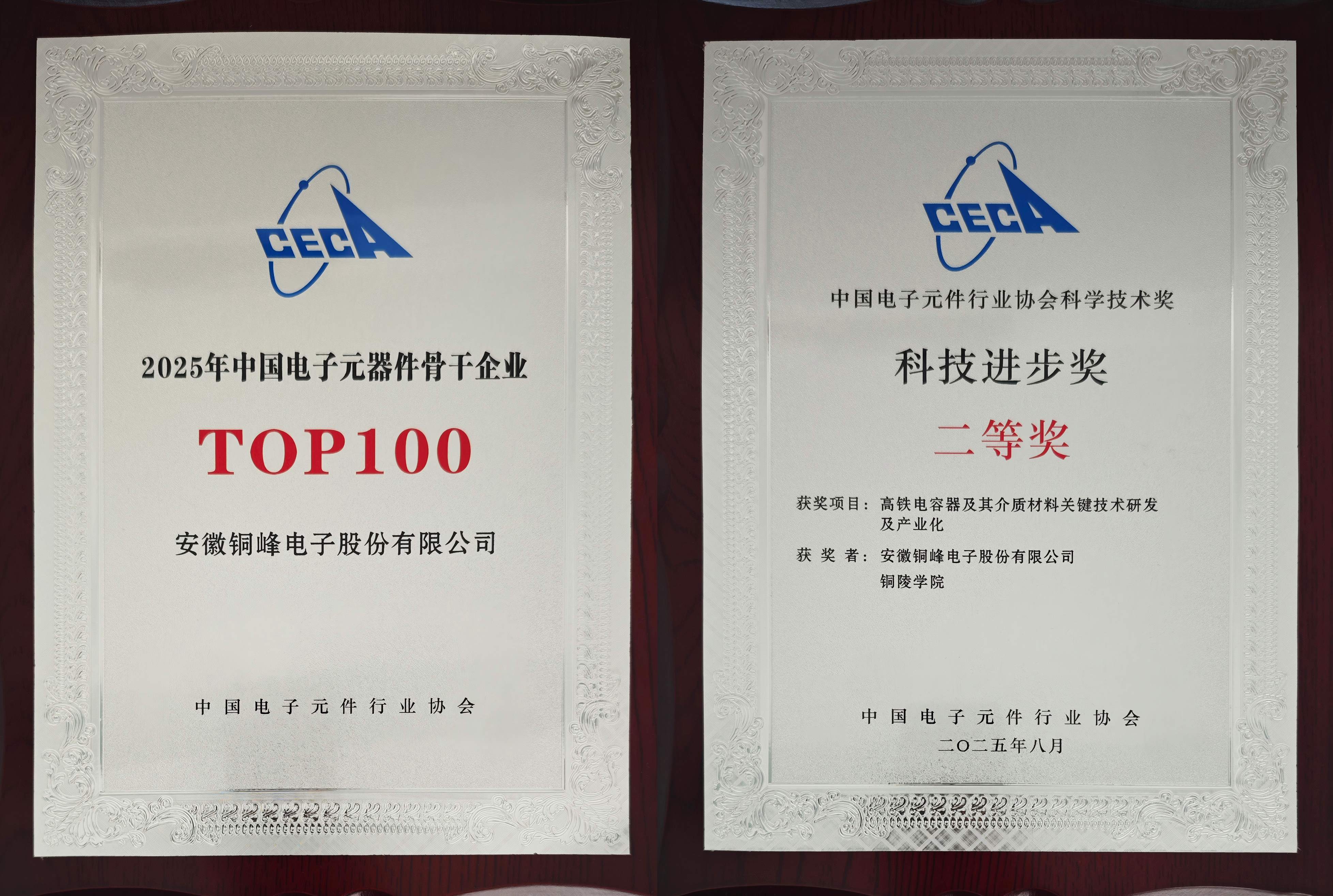 會(huì)議過(guò)程中,除舉辦主題演講、高端對(duì)話(huà)、分會(huì)平行論壇外,還舉行了2025年中國(guó)電子元器件骨干企業(yè)、2025年度(第3屆)中國(guó)電子元件行業(yè)協(xié)會(huì)科學(xué)技術(shù)獎(jiǎng)?lì)C獎(jiǎng)儀式,公司連續(xù)三十余屆獲評(píng)“中國(guó)電子元器件骨干行業(yè)TOP100 ”榮譽(yù),并榮獲中電元協(xié)科技進(jìn)步二等獎(jiǎng)。